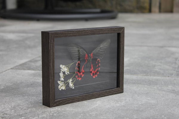 Scarlet Mormon butterfly with dried flowers in a medium black shadowbox